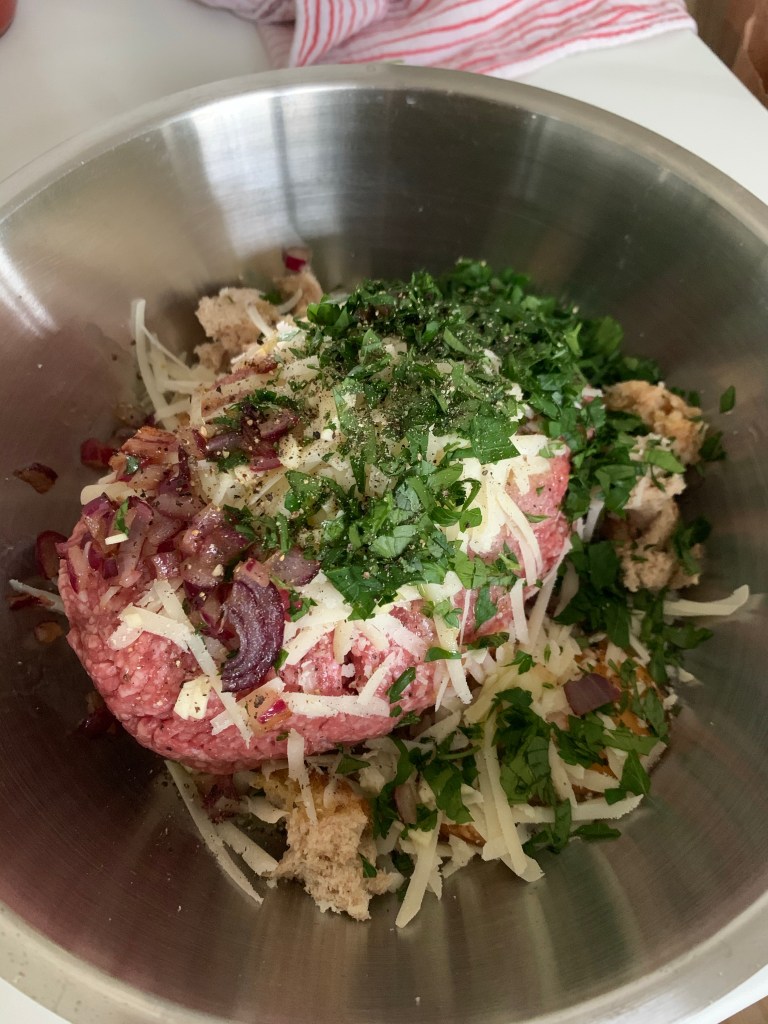 Bitte den Parmesan reiben, die Petersilie hacken und das Brötchen in etwas Wasser einweichen (Milch geht auch, ist aber dann Geschmacksache). Rote Zwiebeln und Knoblauchzehen auch fein hacken. Doch: bevor ihr die gehackten roten Zwiebeln und den Knoblauch dazu fügt, müsst ihr sie in etwas Öl anschwitzen und mit etwas weißen Balsamico ablöschen. Den Samorza (ital. Käse), die Salami klein schneiden und zum Schluss Ei, Olivenöl, etwas Tomatenmark zum Hackfleisch geben und alles gut durchmischen. Ich lasse die Hack-Masse gerne 20 Minuten ziehen bevor ich mit dem Rollen der Bällchen beginne.