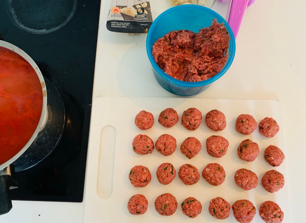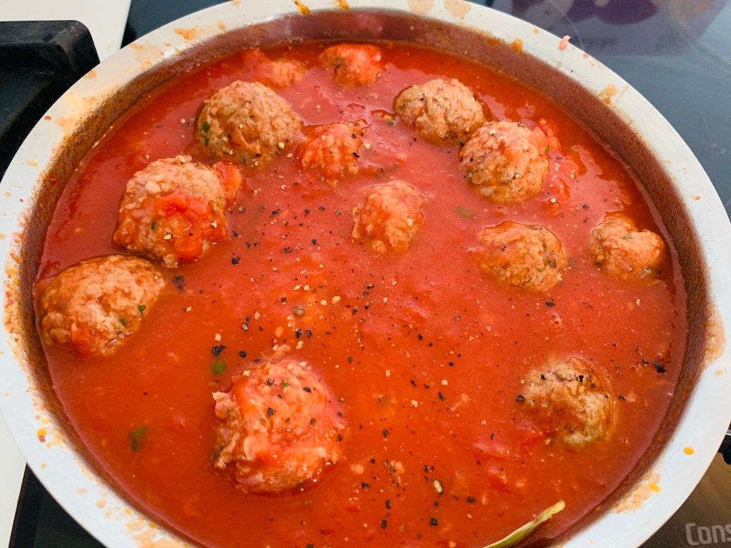 Parallel bereitet ihr eine Tonatensauce zu und wenn sie fast fertig ist, könnt ihr die Fleischbällchen hinein geben – und bitte dann nur ziehen lassen. Nicht kochen!!!